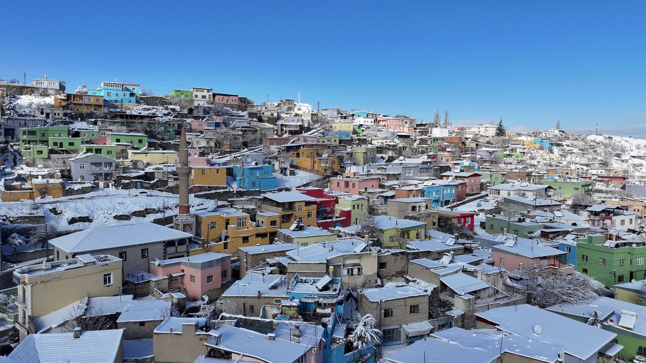 Rengarenk evlerin karla iç içe geçmesi, AA muhabiri tarafından dronla görüntülendi.