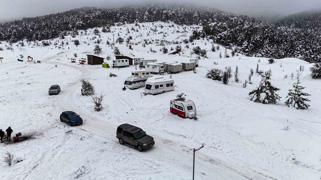 Ankara'nın Kızılcahamam ilçesinde bulunan Işık Dağı eteklerindeki Karagöl Jeositi, kar yağışıyla beyaza bürünürken, kış tatilini doğayla iç içe geçirmek isteyen Başkentlilerin yeni adresi Uludağ yerine Işık Dağı oldu.