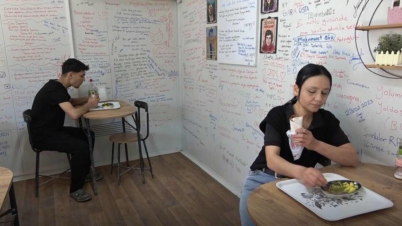 İş yeri sahibi Ali Akkuş, deprem sonrası konteynerde faaliyet göstermeye devam ettiklerini belirterek, 'Yeni yapılacak iş yerlerimizin hazırlanmasını ve teslim edilmesini bekliyoruz. Bu süreçte konteynerde hem yaşam mücadelesi veriyor hem de çalışmayı sürdürüyoruz. Bu fikir aslında müşterilerimiz için yazdığım birkaç yazıyla başladı. En azından yemek yerken göz aşinalığı olsun, okusunlar istedim. Sonrasında bu durum bir konsepte dönüştü. Gelen müşterilerimiz hatıralarını, acılarını ve sevdiklerini buraya yazıp paylaştılar. Duvarlarımız neredeyse tamamen doldu. Şu anda buraya karşı çok büyük bir ilgi var. Yazıları gördükten sonra çok uzak yerlerden gelenler bile oluyor. Yer kalmadığı için gelenler yazılarını sağa sola sığdırmaya çalışıyor. Burası adeta bir anı ve duygu duvarına dönüştü' dedi.