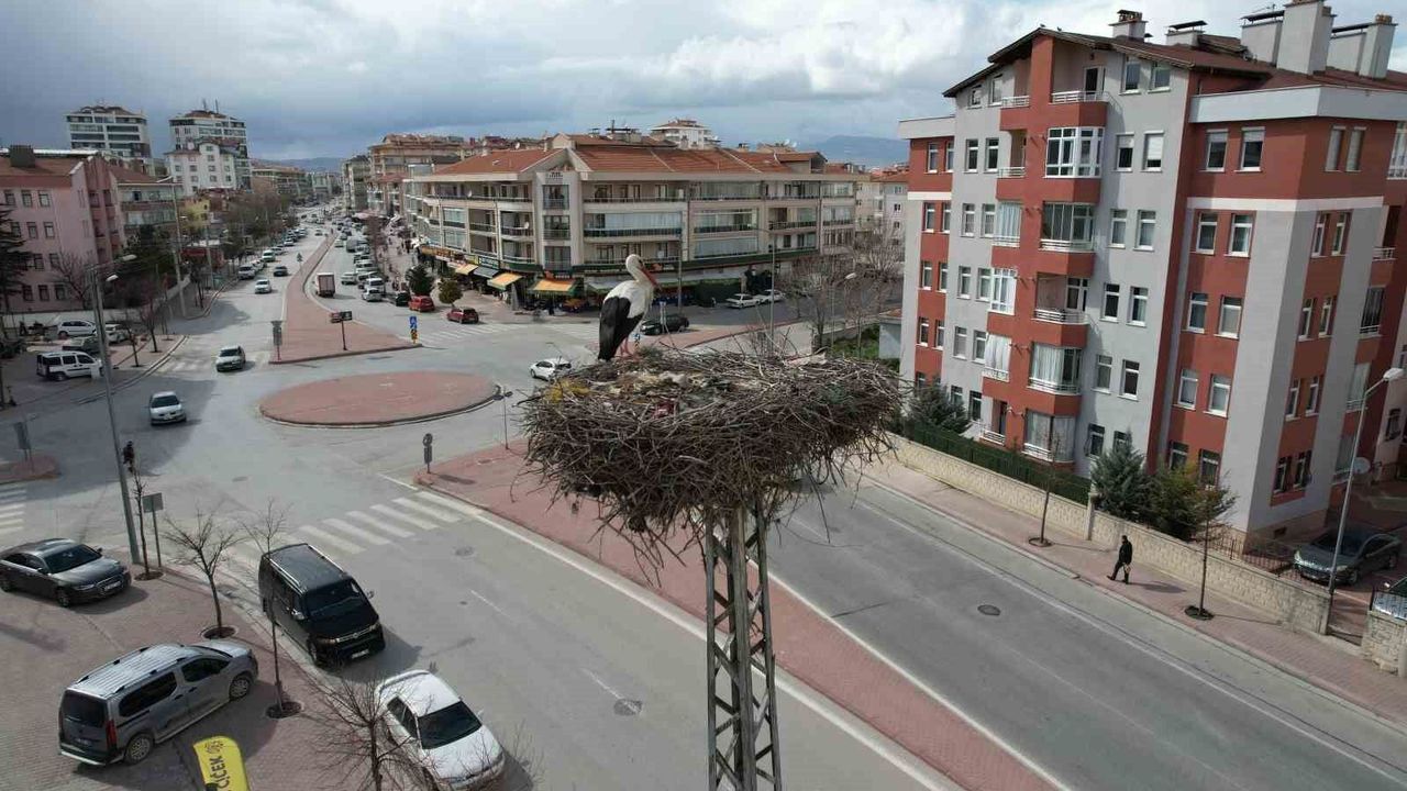 Konya şehir merkezinde baharın habercisi leylekler, bu yıl da yıllardır mesken tuttukları direk üzerindeki yuvalarına geldi.