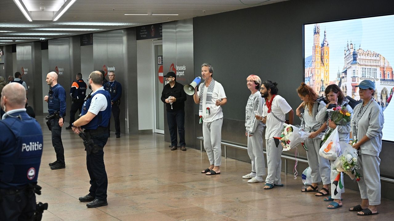 Küresel Sumud Filosu aktivistlerinin yakınları ve Filistin destekçilerinden oluşan kalabalık, sabah erken saatlerden itibaren Brüksel Uluslararası Havalimanı'nda toplandı.