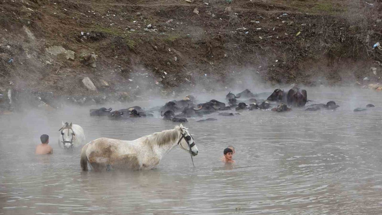 Sıcak su kaynaklarında yıkanan hayvanlar, özellikle fotoğraf tutkunlarının ilgi odağı haline geldi. Bölgedeki besiciler tarafından kaplıca alanına getirilen manda ve atlar, şifalı olduğu bilinen termal sularda temizleniyor. Soğuk havaya rağmen sıcak suyun içinde sakin bir şekilde bekleyen hayvanlar, buharın da etkisiyle etkileyici görüntüler oluşturuyor.
