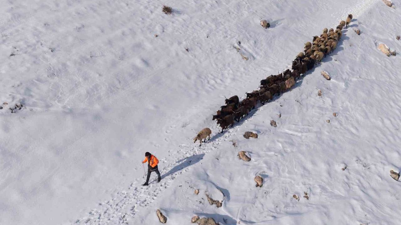 İlçe genelini beyaza bürüyen kar yağışı sonrası, kırsal mahallelerde yaşayan çiftçiler hayvanlarını beslemek için yoğun çaba sarf ediyor. Kış şartlarının ağırlaştığı bölgede, yemleme maliyetlerini düşürmek ve hayvanların hava almasını sağlamak isteyen çobanlar, karla kaplı arazilerin yolunu tutuyor. Mazıdağı kırsalında sürüsünü otlatmaya çıkaran bir çobanın eve dönüş yolculuğu havadan görüntülendi. Karla kaplı tepelerde, hayvanların oluşturduğu patika izinden ilerleyen çoban ve sürüsünün görüntüsü, bölgedeki kış şartlarının zorluğunu gözler önüne serdi. Soğuk havaya ve engebeli araziye rağmen ekmek parası için mücadele veren üreticiler, gün batımına doğru ağıllarının yolunu tutuyor.