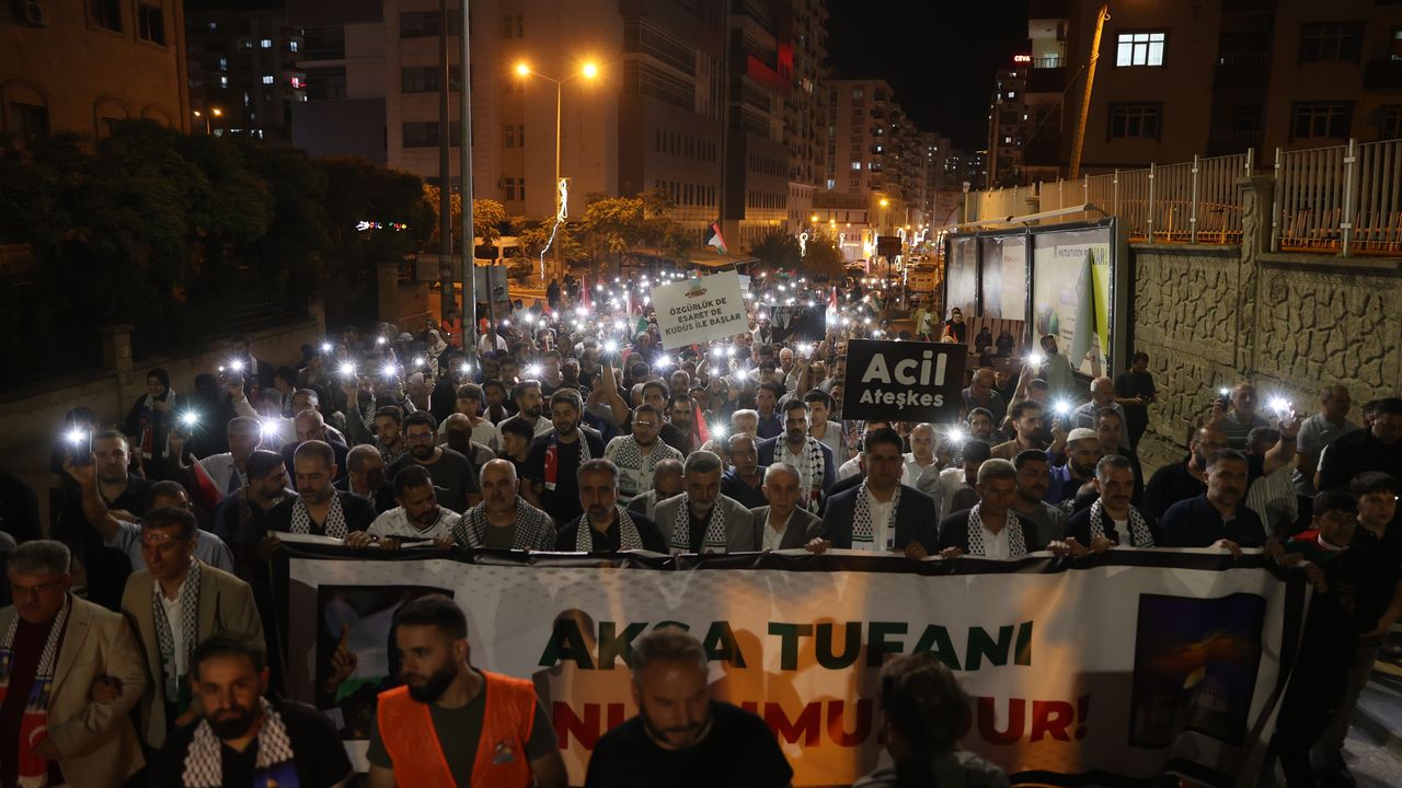 Mardin Sivil Toplum Kuruluşları Platformu öncülüğünde Artuklu Fuar Alanı'nda bir araya gelen katılımcılar, ellerinde Türk ve Filistin bayraklarıyla tekbir getirdi, İsrail karşıtı sloganlar attı.