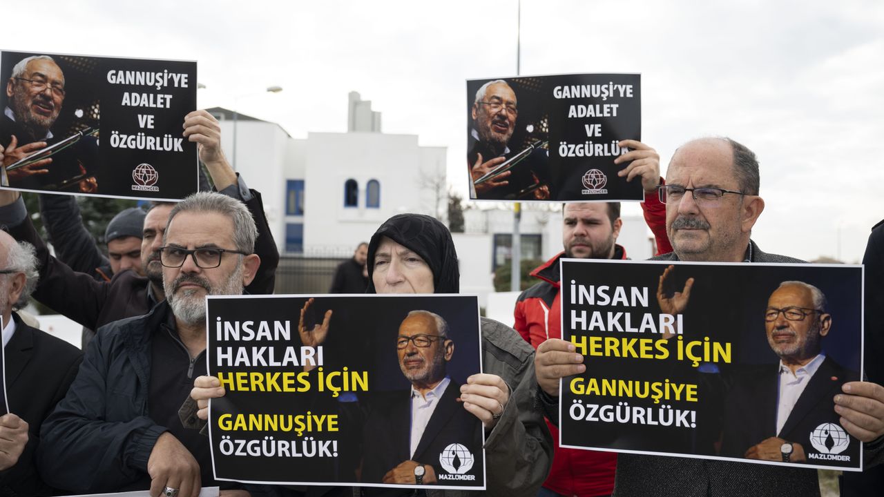 Dernek üyeleri, Gannuşi'ye destek mesajları içeren dövizlerle Tunus Büyükelçiliği önünde toplanarak, Gannuşi'nin serbest bırakılmasını talep eden sloganlar attı.