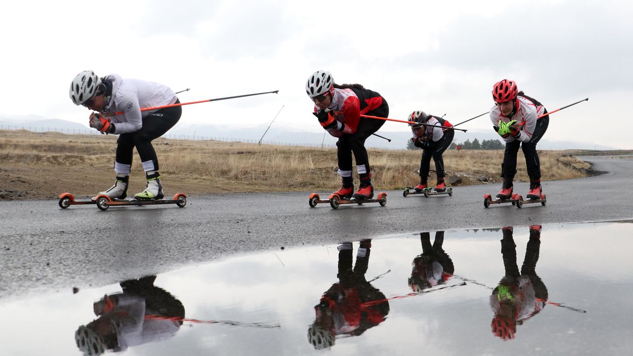 Kış aylarında kullandıkları kayakların yerine tekerlekli kayak kullanan sporcular, bu sayede yıl boyu antrenman yapma imkanı buluyor.