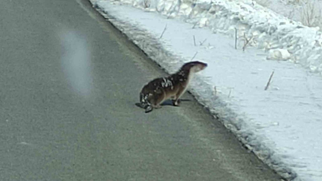 Ardahan'da yolunu kaybeden su samuru kara yolu kenarında görüntülendi.