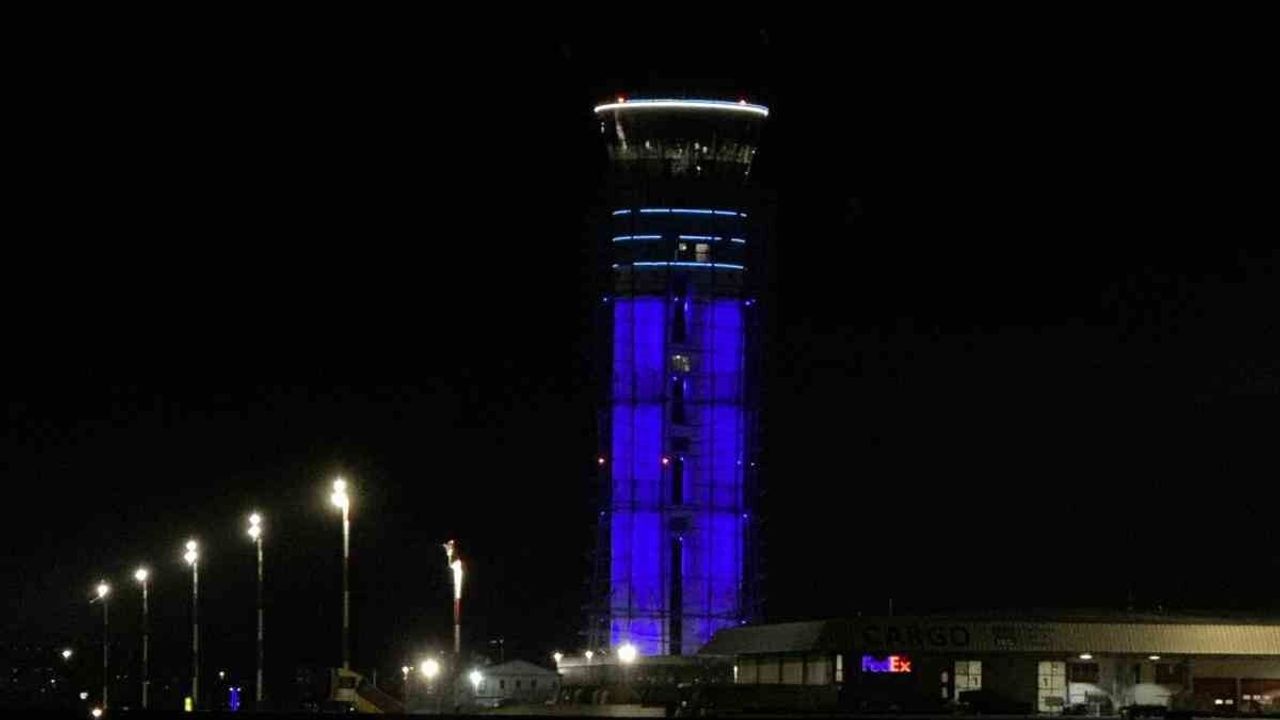 Dünya Otizm Farkındalık Günü nedeniyle Sabiha Gökçen Havalimanı Hava Trafik Kontrol Kulesi mavi ışıkla aydınlatıldı.