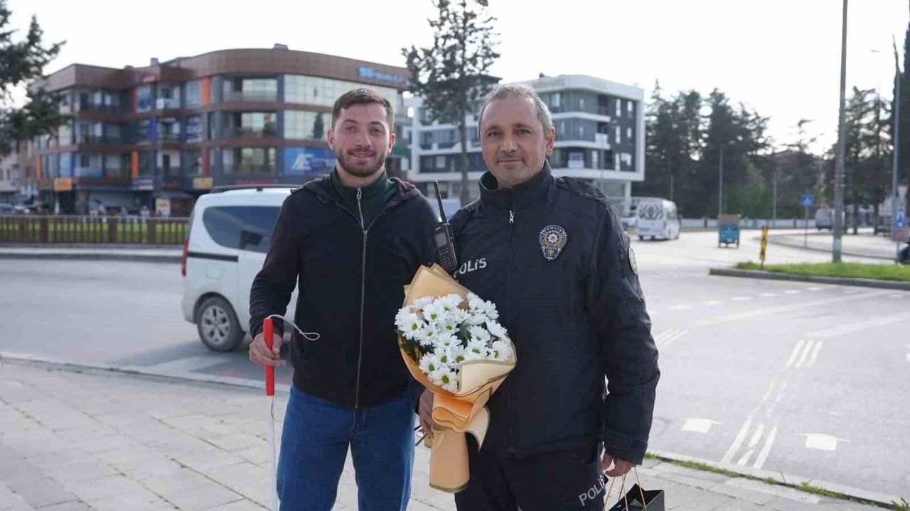 DÜZCE (İHA) - Düzce Belediyesi tarafından 10 Nisan Polis Günü nedeniyle, Düzce İl Emniyet Müdürlüğü'nde görevli polislere sürpriz hazırlandı. Polisler bir öğrenciyi sınava yetiştirmeye çalışırken bir yandan da görme engelli bir vatandaşı karşıdan karşıya geçirmeye çalıştı. Olayların kendilerine yapılan sürpriz olduğunu öğrenen ve çiçeklerle karşılanan polisler büyük mutluluk yaşadı.