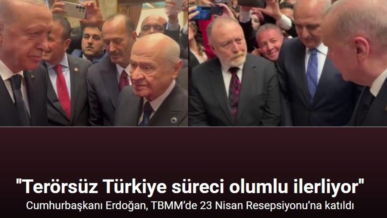 Cumhurbaşkanı Erdoğan ve MHP Lideri Bahçeli TBMM'deki 23 Nisan Resepsiyonu'nda bir araya geldi. Erdoğan ve Bahçeli, resepsiyonda sohbet etti.