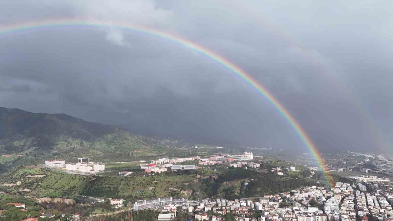 Aydın il genelinde günlerdir etkili olan yağışlı hava etkisini sürdürüyor. Sağanakla beraber zaman zaman günlük hayatta olumsuzluklar yaşanırken, bereketli toprakları yağmura doyan Aydın, yağış sonrası ortaya çıkan gökkuşağı görüntüsü ile mest etti. Sağanak sonrası bulutların arasından yüzünü gösteren güneşle birlikte şehri saran gökkuşağı ise izleyenleri etkiledi. Vatandaşlar o anları cep telefonu ile görüntülerken, Aydın'ı saran gökkuşağı ise dron kamerası ile görüntülendi. Bir ucu Aydın'a bir ucu ise Tralleis antik kentine uzanan gökkuşağı bir süre sonra ortadan kayboldu.