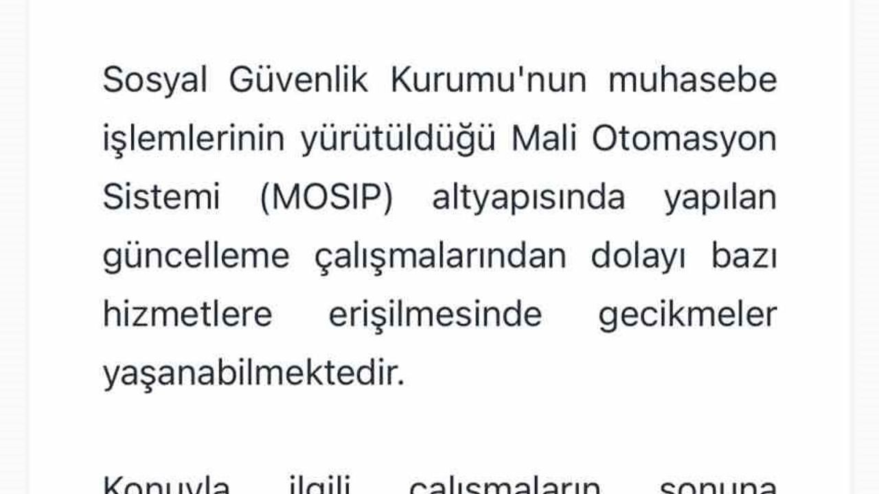 Sosyal Güvenlik Kurumu'nun muhasebe işlemlerinin yürütüldüğü Mali Otomasyon Sistemi (MOSİP) altyapısında yapılan güncelleme çalışmalarından dolayı bazı hizmet ekranlarına erişim sağlanamıyor.