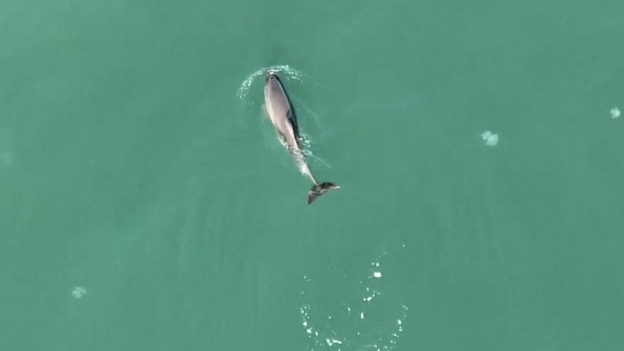 Daha sonra balık avlamaya başlayan yunus, bu sırada dronla görüntülendi.