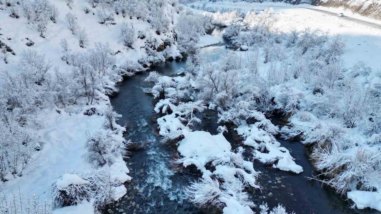 Şırnak'ın Beytüşşebap ilçesinden geçen Yeşilöz deresi çevresinde kar yağışı sonrası görsel şölen oluştu. Mağara, dere yatağı ve ağaçların beyazlar içinde kaldığı bölgeler göz kamaştırdı. Beyazın güzelliğini yansıdığı görüntüler dronla kaydedildi.