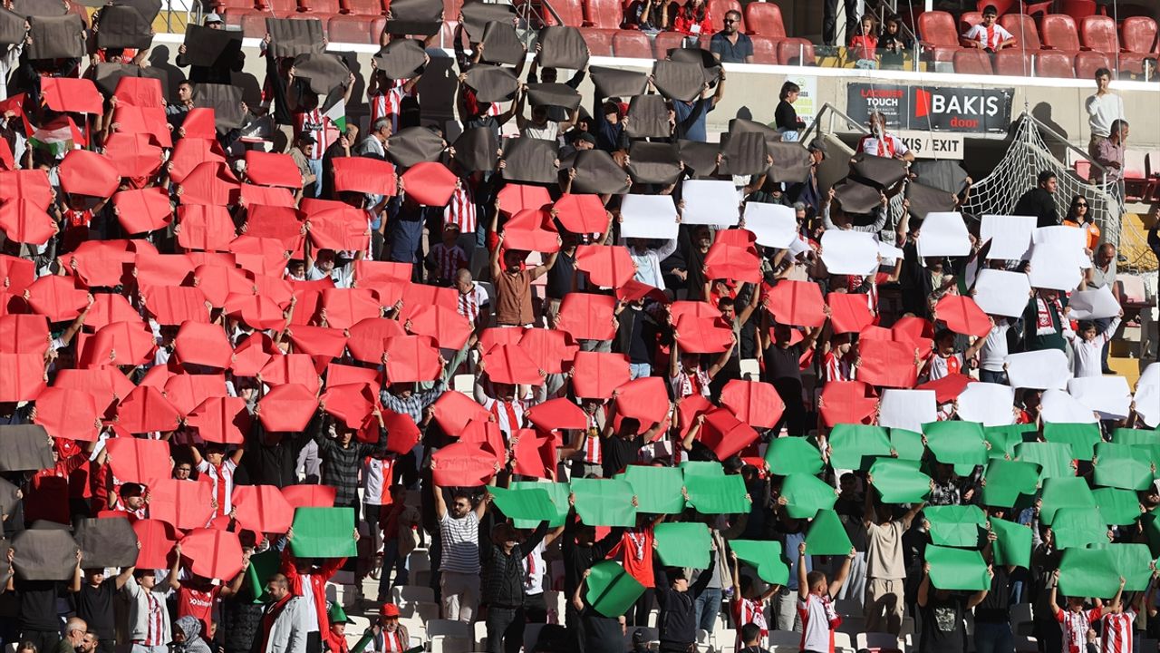 Sivasspor taraftarları, 4 Eylül Stadyumu'ndaki maç öncesi Gazze'de yaşanan insanlık dramına dikkati çekmek için koreografi hazırladı.