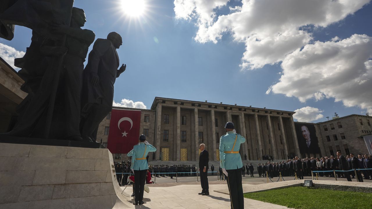 TBMM Başkanı Numan Kurtulmuş'un anıta çelenk bırakmasının ardından bando eşliğinde saygı duruşunda bulunularak, İstiklal Marşı okundu.