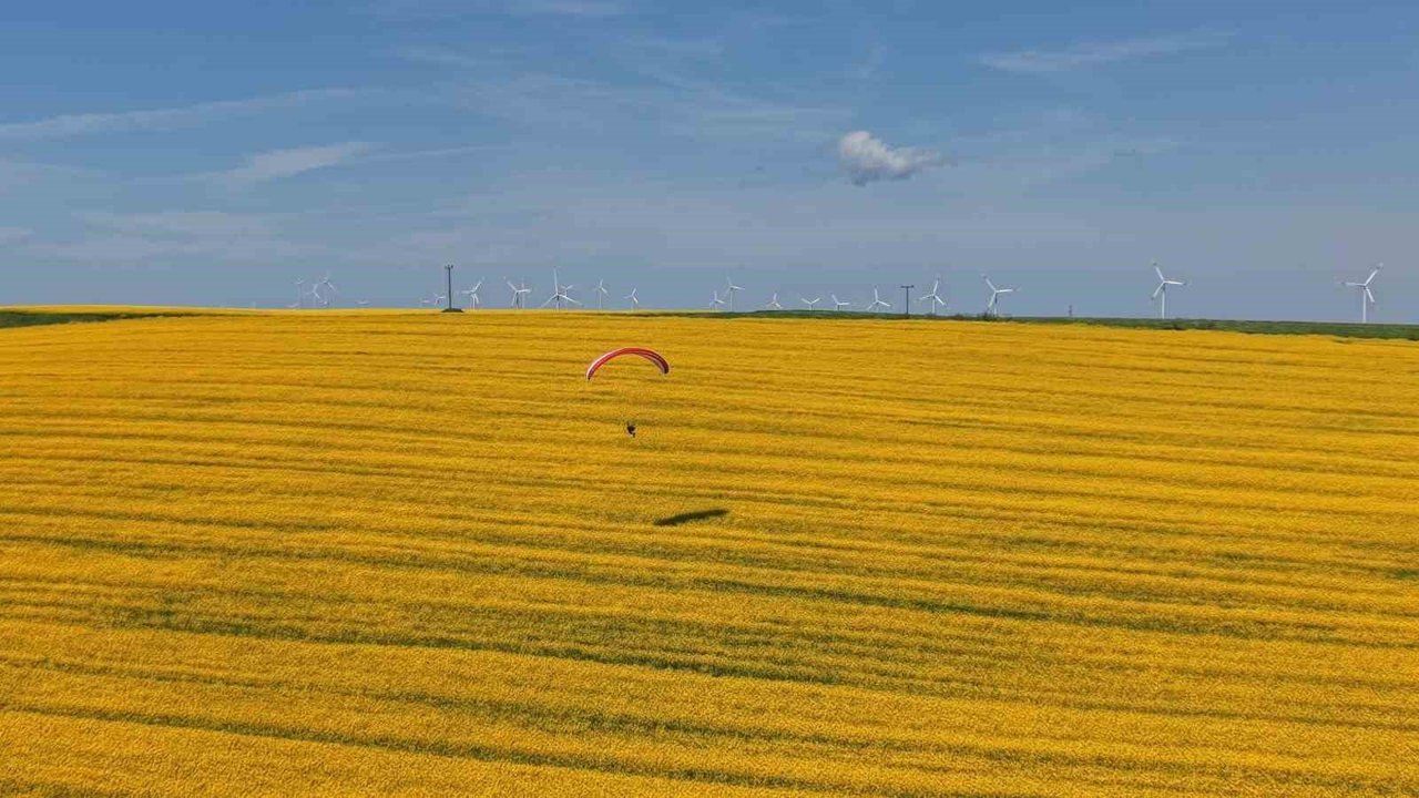 Tekirdağ'da yaşayan paraşüt eğitmeni Kadir Aksoy, bahar aylarıyla birlikte sarıya bürünen kanola tarlalarına dikkat çekmek ve farkındalık oluşturmak amacıyla anlamlı bir etkinliğe imza attı. Süleymanpaşa ilçesine bağlı Gaziköy Mahallesi'nde hazırlıklarını tamamlayan Aksoy, paramotoruyla havalanarak adeta sarı bir denizi andıran kanola tarlaları üzerinde uçuş gerçekleştirdi.