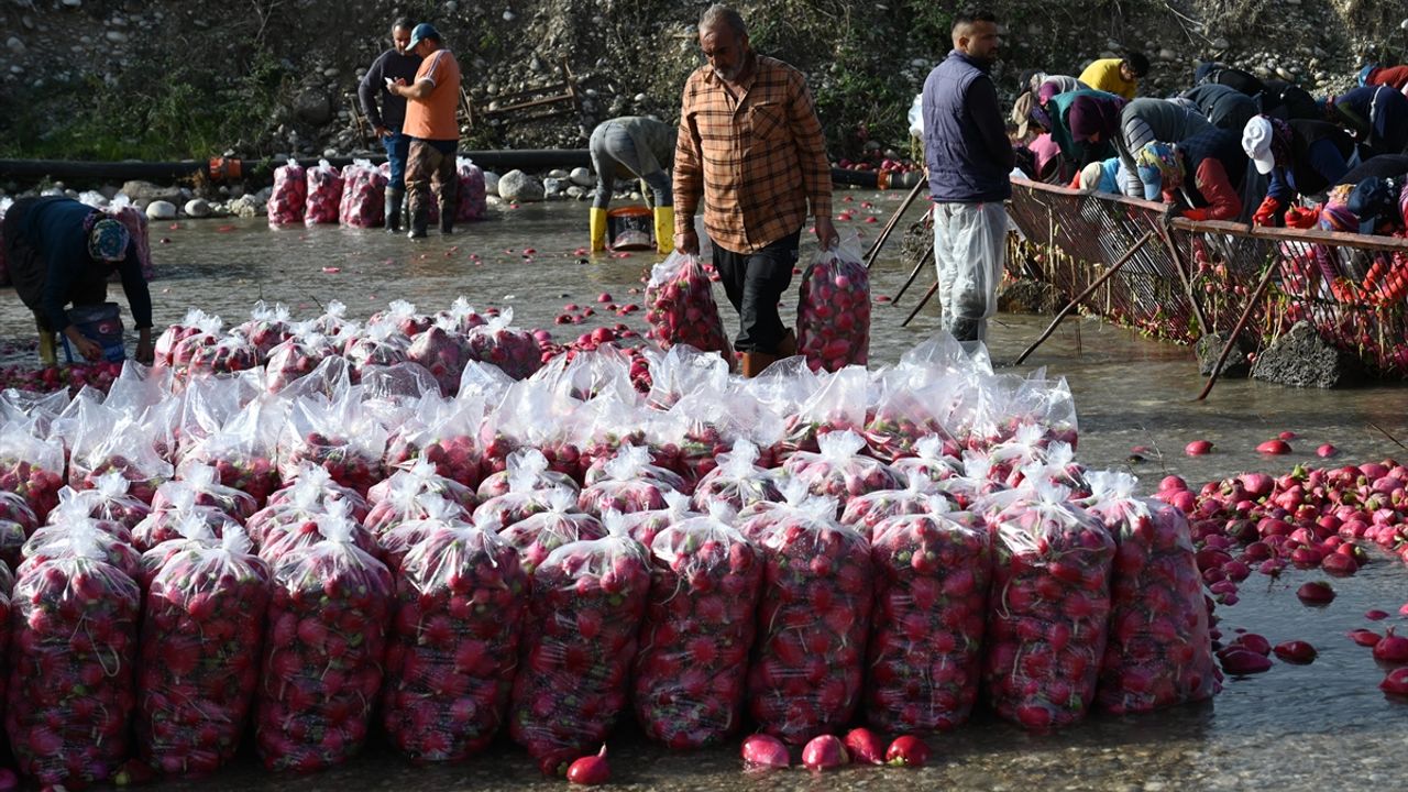 Yetiştirildiği ilçenin adıyla tescillenen kırmızı turplar, hasat edildikten sonra çamurdan arındırılması için Savrun Çayı'na taşınıyor.