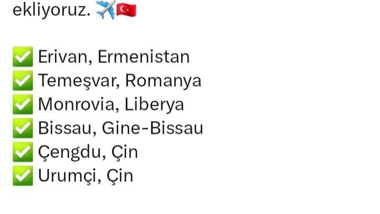 Bilal Ekşi konuyla ilgili sosyal medya hesabından yaptığı açıklamada şu ifadelere yer verdi: '2026'da da yeni noktaları uçuş ağımıza ekliyoruz. Erivan, Ermenistan, Temeşvar, Romanya, Monrovia, Liberya, Bissau, Gine-Bissau,Çengdu, Çin, Urumçi, ÇinDünyanın en çok ülkesine uçan havayolu unvanımızı daha da güçlendiriyoruz.'