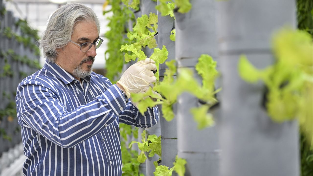 'Bu tesiste AR-GE kule dizilimi bulunuyor. Bu haliyle yaklaşık olarak 1500 bitkiye kadar çıkabiliyoruz. 40 metrekarelik bir alan düşünürsek oldukça verimli. Dikey yetiştiricilik dünyada uzun yıllardır uygulanan Türkiye'de belli yerlerde denenen bir sistem. Genel olarak yurt dışından malzemelerin temin edilmesi nedeni ile ilk kurulum maliyetleri yüksek olduğu için çok fazla uygulanan bir üretim çeşidi değil. Burada topraksız üretim yapılıyor, genellikle dikey tarım sistemlerinde ve topraksız tarımın da ana unsuru köklerin açık bir şekilde bulunması, su ve gübre karışımının da doğal olarak doğrudan köke gelip minimum su, minimum gübre tüketimi, aynı zamanda minimum enerji sarfiyatıyla bitkinin yetişmesi sağlanıyor.'