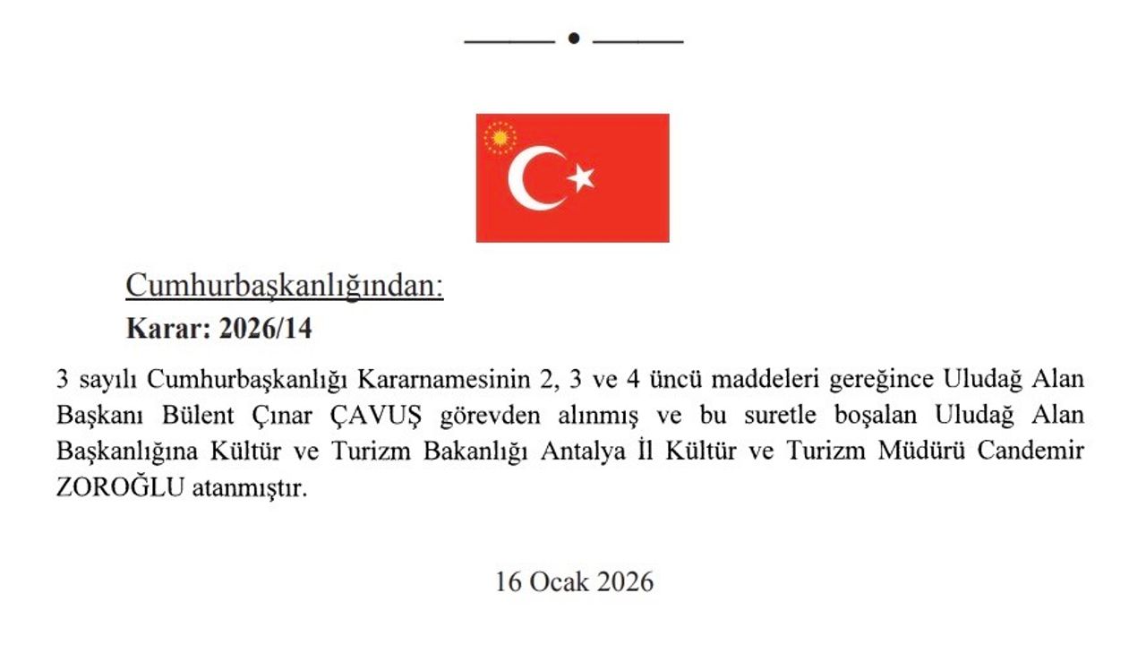 17 Ocak 2026 Cumartesi günü yayımlanan Resmi Gazete kararlarına göre, 3 sayılı Cumhurbaşkanlığı Kararnamesinin 2, 3 ve 4'üncü maddeleri gereğince Uludağ Alan Başkanı Bülent Çınar Çavuş görevden alındı. Çavuş'tan boşalan Uludağ Alan Başkanlığı görevine, Kültür ve Turizm Bakanlığı Antalya İl Kültür ve Turizm Müdürü Candemir Zoroğlu atandı.