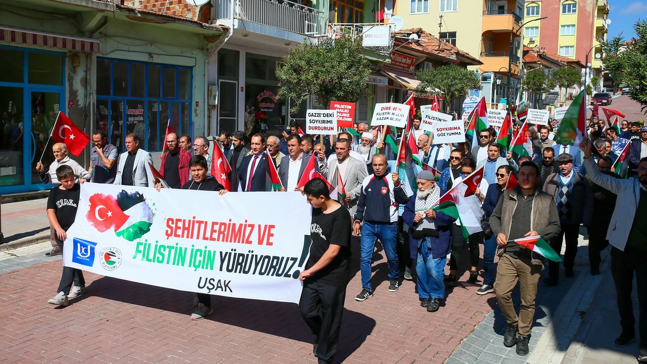 UŞAK (AA) - Uşak'ın Ulubey ilçesinde, Filistin ve Gazze'ye insani yardım ulaştırmayı ve İsrail'in yıllardır uyguladığı ablukayı kırmayı amaçlayan Küresel Sumud Filosu'na destek yürüyüşü gerçekleştirildi.