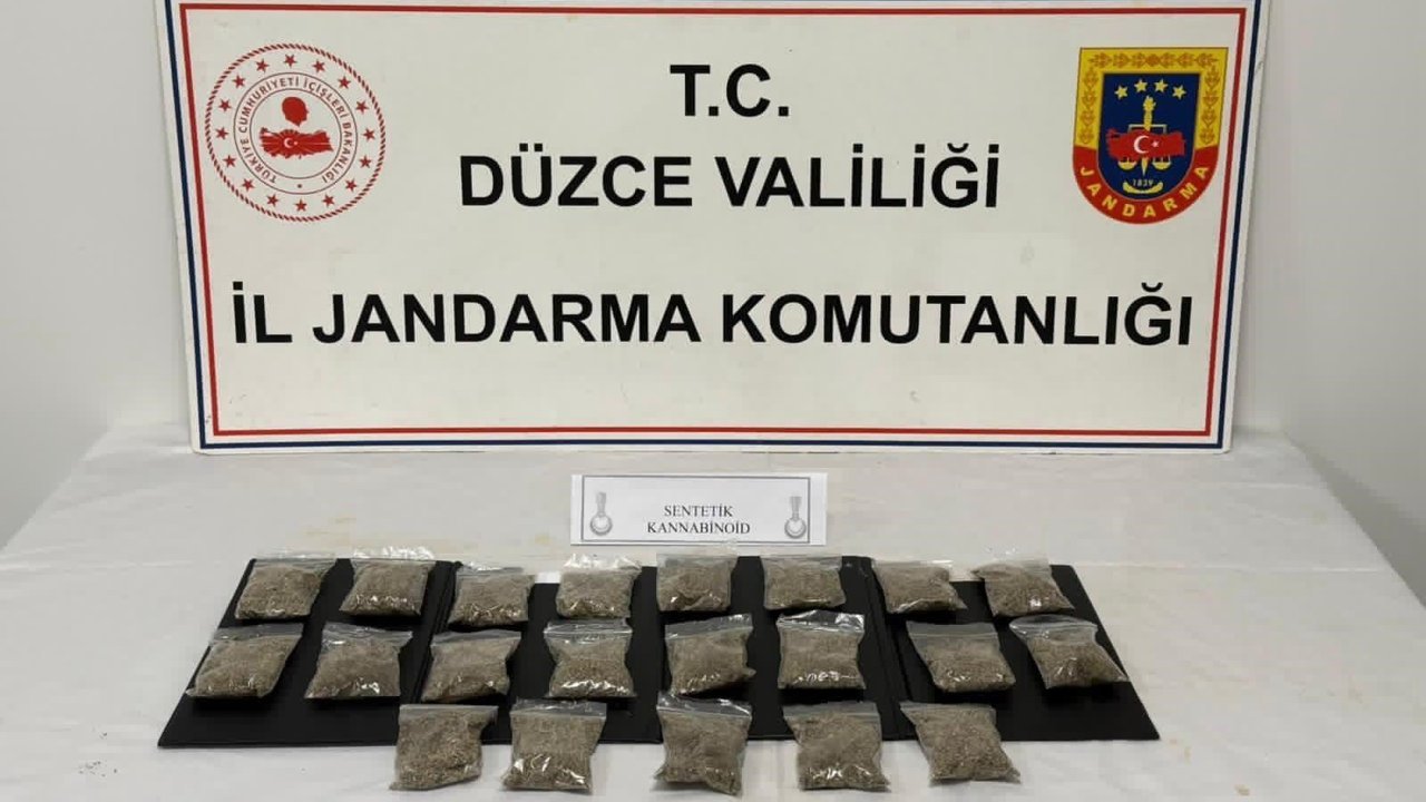 Düzce Cumhuriyet Başsavcılığı koordinesinde İl Jandadma Komutanlığı Narkotik Suçlarla Mücadele Şube Müdürlüğü ekiplerince yürütülen çalışmalarda merkez ilçede H.T isimli şahsın il dışından getirdiği uyuşturucu maddelerin ticaretini yaptığı tespit edildi. Jandarma ekiplerinin yaptığı baskında H.T isimli şahıs uyuşturucu maddeleri satışa hazırlarken yakalandı. Şahsın evinde yapılan aramada 21 adet 50'şer gramlık paketler halinde, toplam 1 kilo 50 gram uyuşturucu madde emdirilmiş sentetik kannabinoid ele geçirildi. H.T isimii şahıs göz altına alınırken hakkında adli işlem başlatıldı.