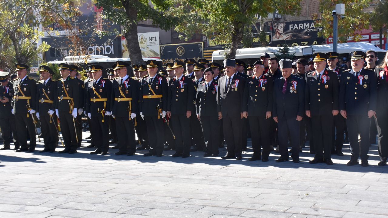 Gökmeydan'da gerçekleştirilen törende, Vali Ahmet Karakaya, Garnizon Komutanı Tuğgeneral Tahir Kılıç ve Belediye Başkanı Nesrullah Tanğlay, Atatürk Anıtı'na çelenk sundu.