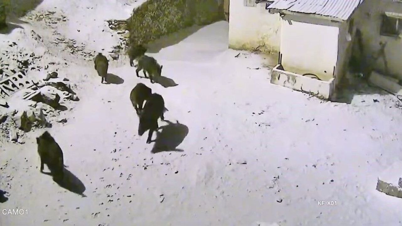 Elazığ'da kar yağışı sonrası doğada yiyecek bulmakta güçlük çeken domuzlar, Baskil ilçesi Hacıhüseyinler köyüne indi. Köyün içerisinde bulunan güvenlik kamerasına yansıyan domuz sürüsü bir süre sonra gözden kayboldu. O anlar güvenlik kamerası tarafından saniye saniye kaydedildi.