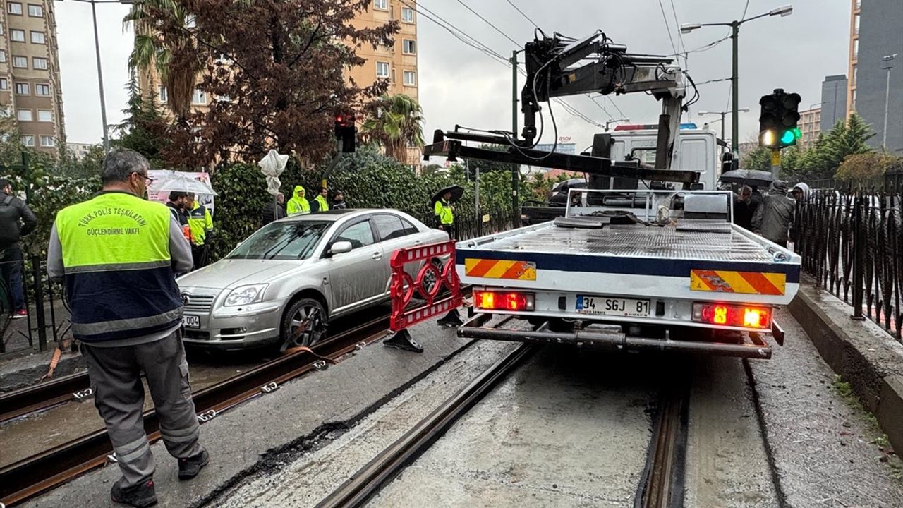 İSTANBUL (AA) - Zeytinburnu'nda tramvay yolunda, rayların üzerinde kalan otomobil nedeniyle seferler aksadı.